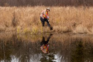 In partnership with Mississippi Valley Conservation Authority, Watersheds Canada led a coldwater creek enhancement project at Easton’s Creek, Ontario in November 2024. This project connected corridors of brook trout habitat in a cold-water creek in Lanark County, where some of the few remaining cold-water brook trout creeks exist in the Mississippi River watershed. In total, 75 potted silver maple and black willow trees were planted along the creek and were wrapped with wire guards and stakes to protect them from animal browsing. Large pieces of organic materials were wrapped around the base of each tree to deter competition from other vegetation species.