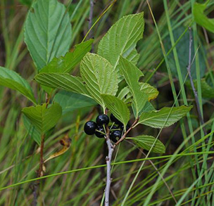 The Alderleaf Buckthorn, also referred to as the Alder Buckthorn, is a small, deciduous shrub, naturally found in wet areas, and widespread throughout Ontario. This species produces a full crown with all branches arising from one main stem. The Alderleaf Buckthorn produces very small, green flowers which bloom late in the spring, turning to dark berries during the fall. These berries are poisonous to humans.Scientific Name: Rhamnus alnifolia