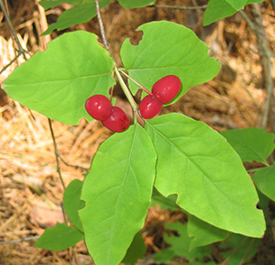 The Fly Honeysuckle is a medium-sized deciduous shrub which is naturally found throughout Ontario, Quebec, and Eastern Canada. This perennial shrub is multi-stemmed with thin, woody branches and can be grown in such a way that it resembles a vine. The Fly Honeysuckle’s leaves are light green, simple, and arranged opposite each other along the branch. Leaves are oval in shape and hairless, except at the margins where fine hairs are visible. This species produces flowers which are bell-shaped, white to yellow in colour, drooping in pairs of two, and bloom during late spring. Flowers give rise to large red-orange berries during late summers, which are a favorite to many songbird species.Scientific Name: Lonicera canadensis