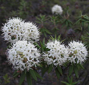 The Labrador Tea is a very hardy, small evergreen shrub which can be found in every province and territory of Canada. This species was collected by Aboriginals to brew a vitamin C rich tea. This slow growing plant produces woolly branches with alternately arranged leaves. Leaves produced by this species are easily recognisable by their deep green colour, wrinkly curved top with smooth edges and hairy, rust coloured underside. The Labrador Tea produces fragrant, showy white flowers which grow in a large flattened cluster at the terminal ends of the branches. This shrub provides a food source for pollinators, however is slightly poisonous to mammals.Scientific Name: Ledum groenlandicum