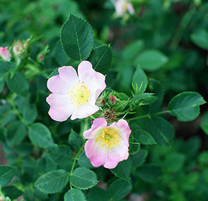 The Smooth Wild Rose’s name is derived from the fact that it is almost thornless with only a few sharp thorns present near its base. This native shrub is best known for producing beautiful pale pink flowers with five saucer-like petals surrounding a yellow centre. The Smooth Wild Rose produces bright red rose hip fruiting bodies which develop during the summer and persist throughout the winter. Leaves produced are alternate and compound, consisting of 5-7 serrated, egg-shaped leaflets. This species of rose grows best in dry to moist, sandy to loamy sites along shorelines, roadsides, and open forests.Scientific Name: Rosa blanda