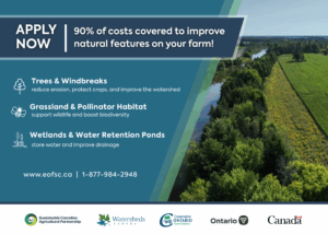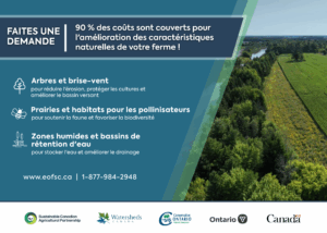23 septembre 2025 — L’Eastern Ontario Farm Stewardship Collaborative, qui regroupe Watersheds Canada, les offices de protection de la nature, Canards Illimités Canada, Forests Canada, Just Food et d’autres partenaires, est fier de lancer l’Initiative pour les terres marginales du Programme des paysages agricoles résilients (PPAR). Cette nouvelle opportunité de financement aidera les agriculteurs et les propriétaires fonciers ruraux à mettre en œuvre des projets sur le terrain visant à améliorer la santé des sols et de l’eau, à restaurer les habitats et à renforcer la résilience climatique.